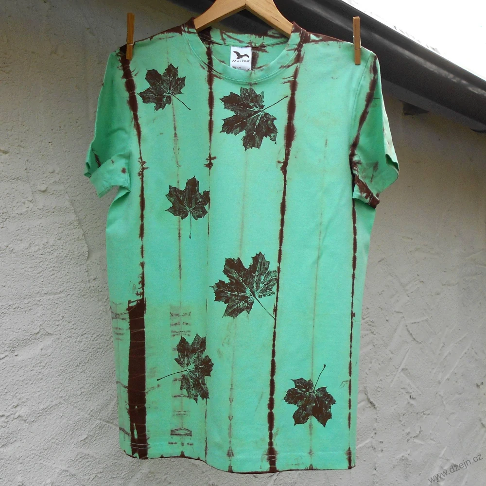 Mentolové unisex tričko je batikované hnědou barvou, na přední straně jsou otisky javorových listů v tmavě hnědé barvě.