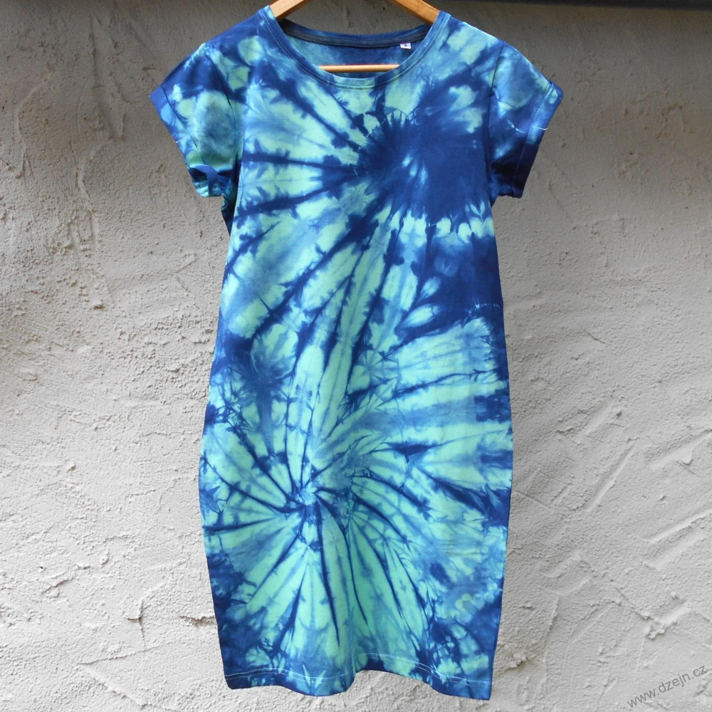 Dámské bavlněné šaty mentolové barvy jsou batikované tmavě modrou barvou, batika tvoří spirály. Velikost vyberte vpravo z rozbalovacího seznamu.
