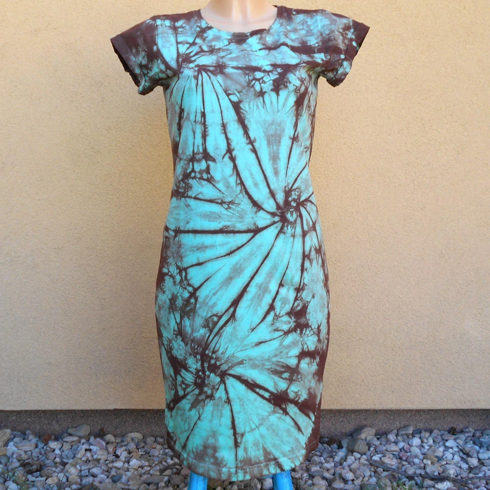 Dámské bavlněné šaty mentolové barvy jsou batikované tmavě hnědou barvou, batika tvoří spirály. Velikost vyberte vpravo z rozbalovacího seznamu.