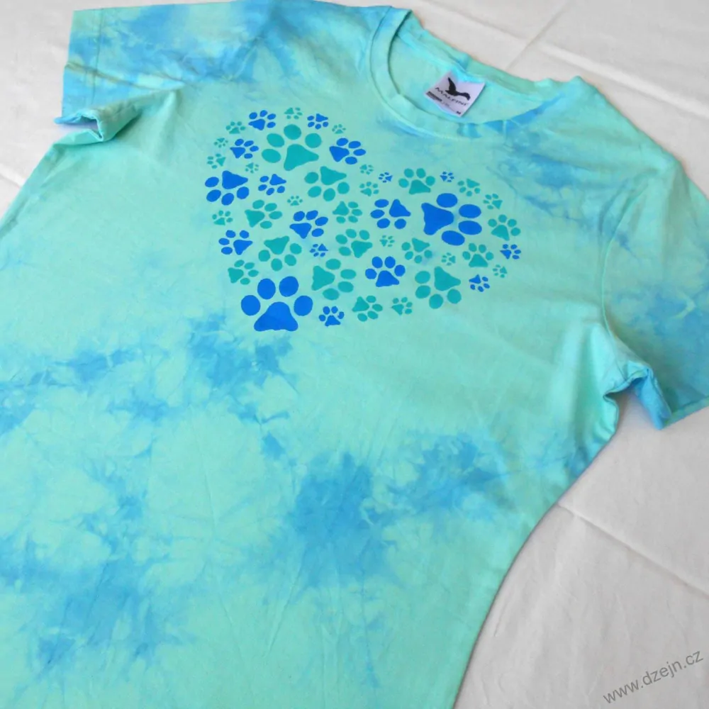 Dámské mentolové tričko je batikované světle modrou barvou a na přední straně jsou natisknuté tyrkysové a modré kočičí (nebo možná psí?) stopy do tvaru srdce. Tričko je mírně projmuté a má kulatý výstřih. Výrobce uvádí velikost M, níže najdete přesné rozměry tohoto konkrétního trička.