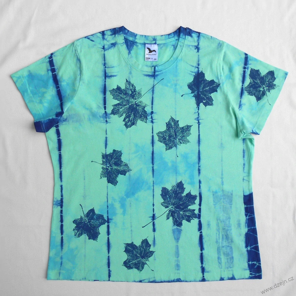 Mentolové dámské tričko je batikované tmavě modrou barvou a na přední straně jsou natisknuté tmavě modré javorové listy. Tričko je mírně projmuté a má kulatý výstřih. Výrobce uvádí velikost XXL, níže najdete přesné rozměry tohoto konkrétního trička.