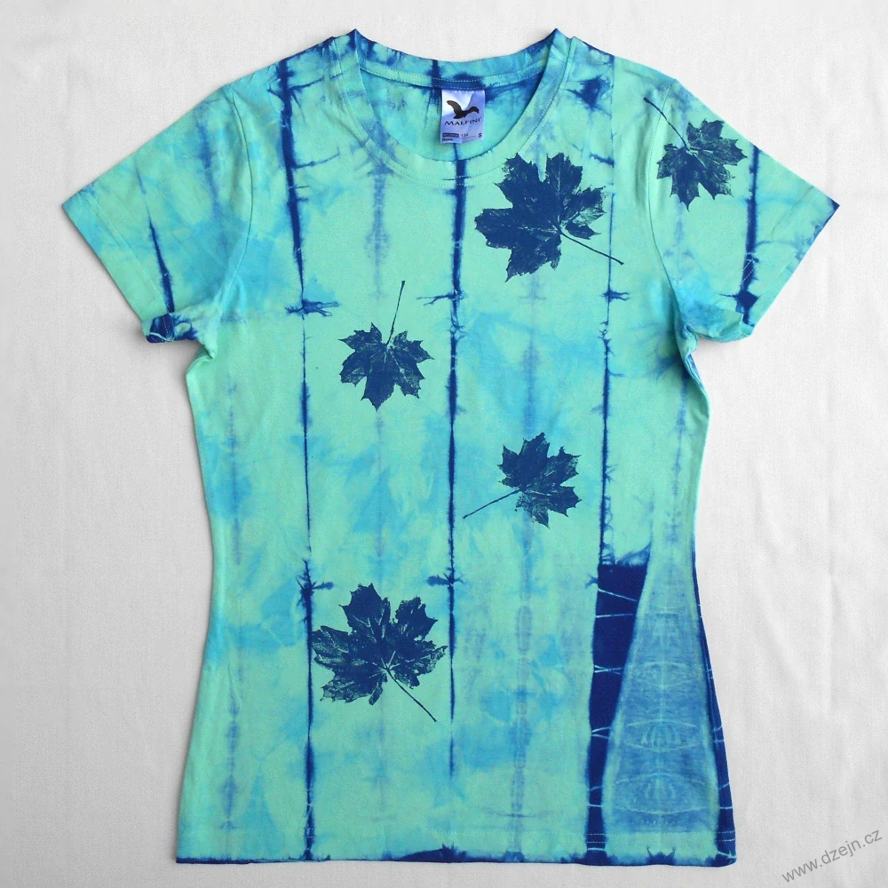 Mentolové dámské tričko je batikované tmavě modrou barvou a na přední straně jsou natisknuté tmavě modré javorové listy. Tričko je mírně projmuté a má kulatý výstřih. Výrobce uvádí velikost S, níže najdete přesné rozměry tohoto konkrétního trička.