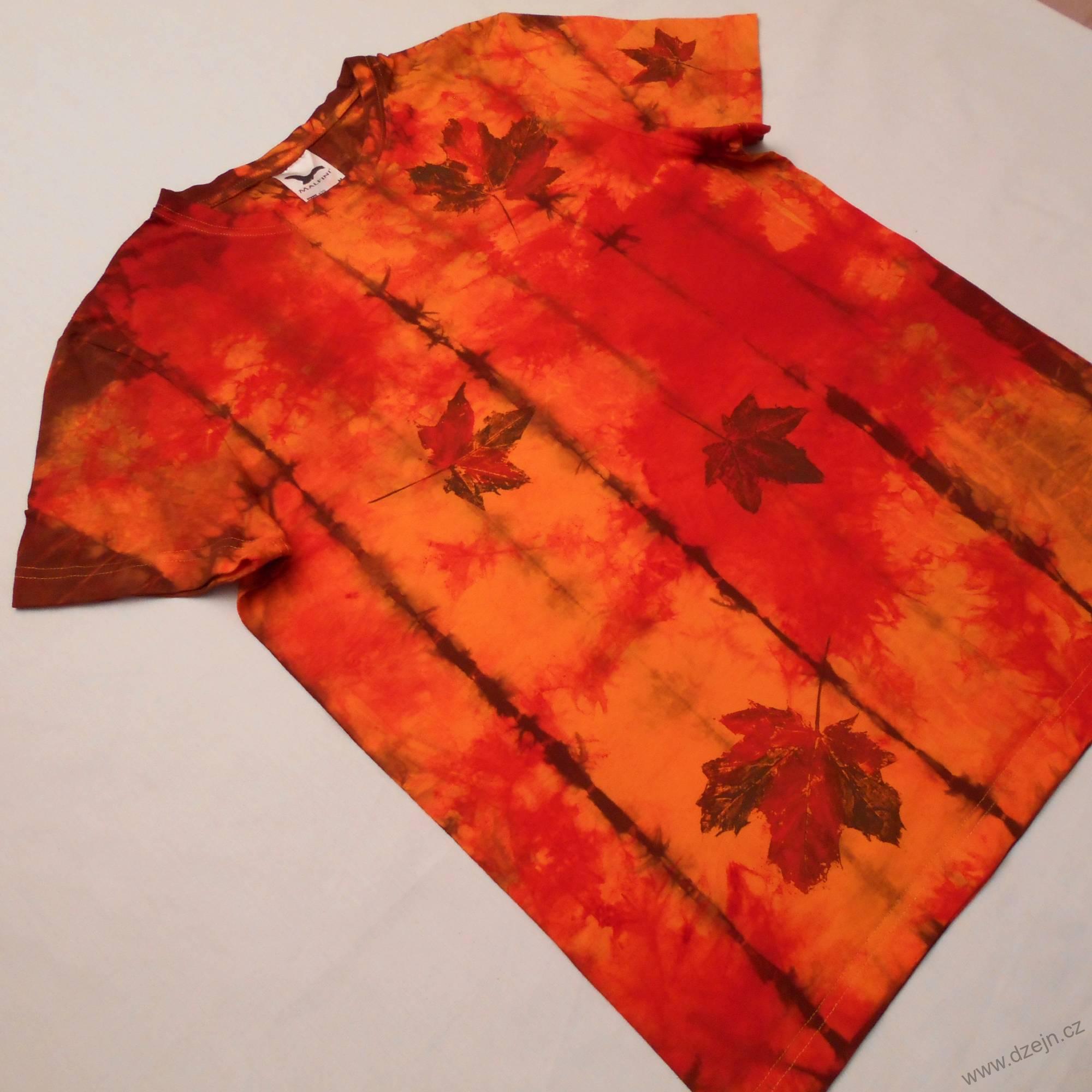 Oranžové unisex tričko je batikované červenou a hnědou barvou, na přední straně jsou natištěné javorové listy v červenohnědé barvě.