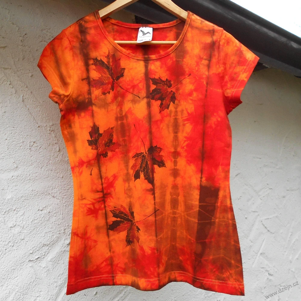 Dámské oranžové triko je batikované červenou a hnědou barvou, na přední straně jsou natisknuté červenohnědé javorové listy. Výrobce uvádí velikost M, níže najdete přesné rozměry tohoto konkrétního trička.