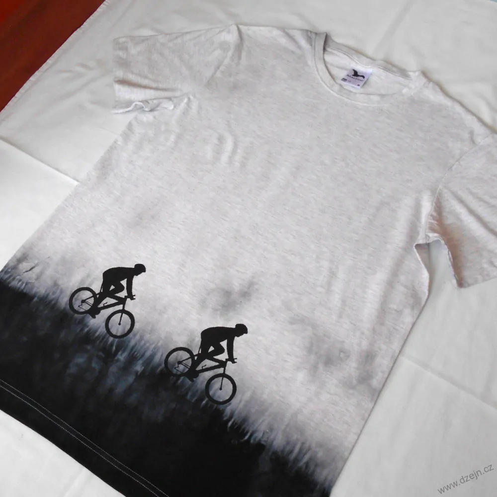 Unisex tričko barvy šedý melír je batikované černou barvou, na přední straně jsou dva černí cyklisté zhotovení ručním sítotiskem.