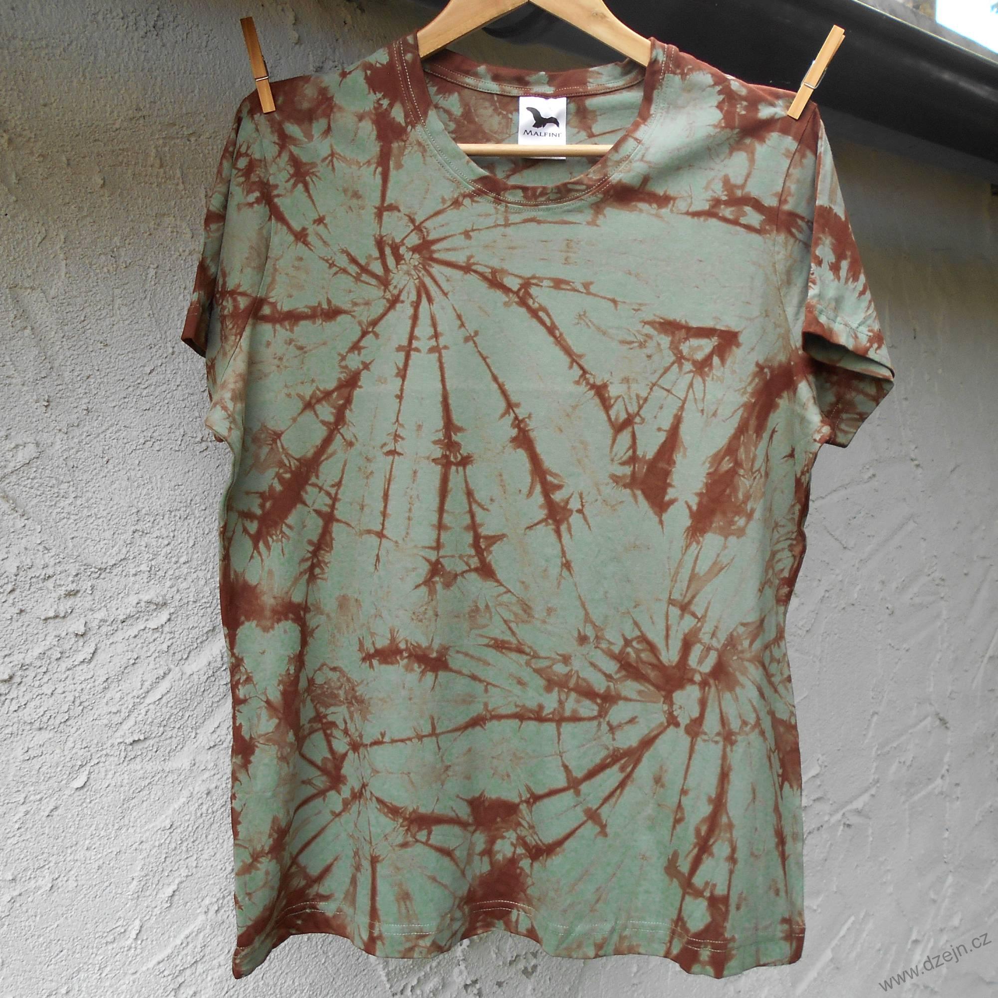 Dámské šedozelené tričko je batikované hnědou barvou. Tričko je mírně projmuté a má kulatý výstřih. Výrobce uvádí velikost XL, níže najdete přesné rozměry tohoto konkrétního trička.