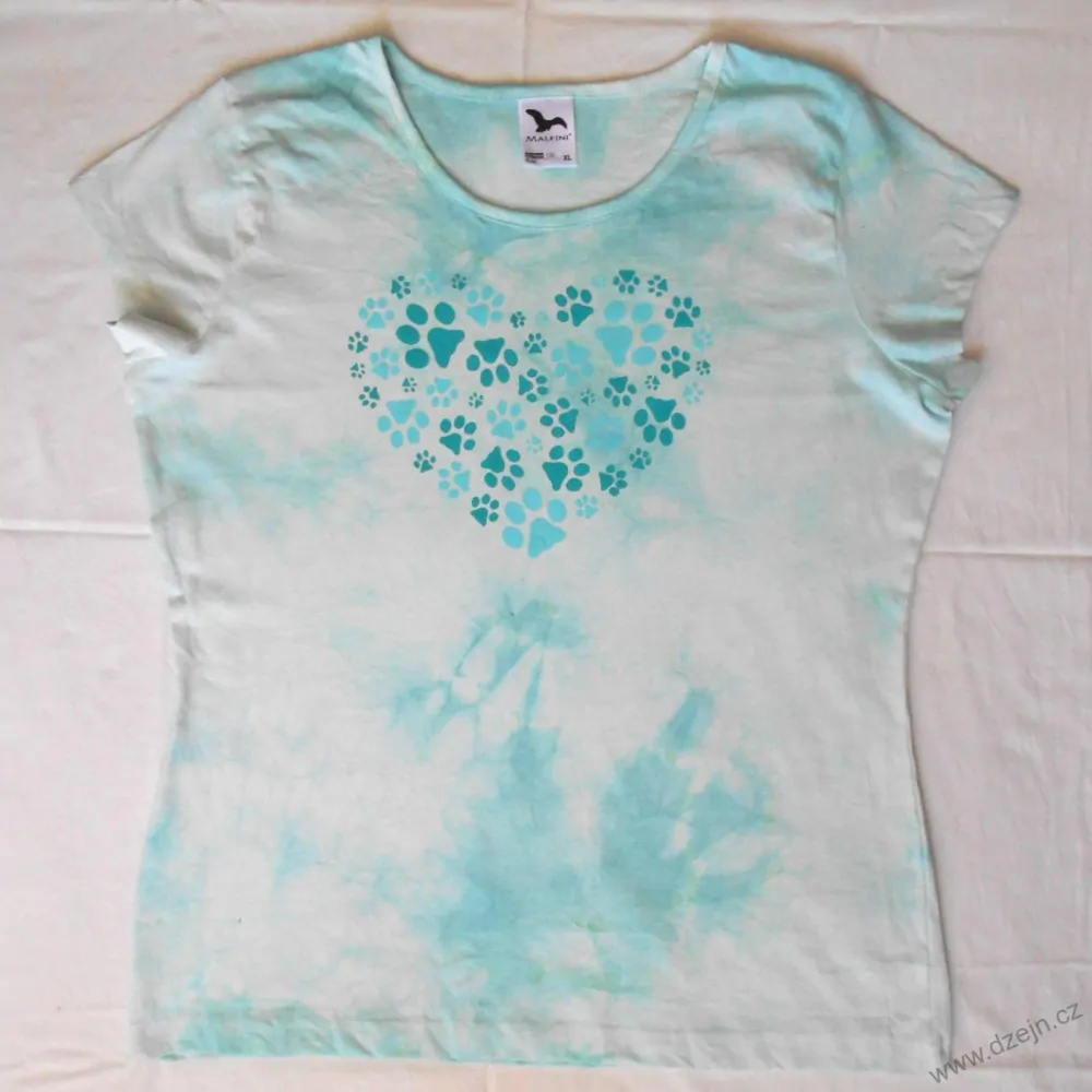 Dámské bílé tričko barvy frost (světloučká mentolová) je batikované mentolovou (nebo tyrkysově zelenou?) barvou a na přední straně jsou natisknuté tyrkysově zelené a světle tyrkysové kočičí (nebo možná psí?) stopy do tvaru srdce. Tričko je mírně projmuté a má kulatý výstřih. Výrobce uvádí velikost XL, níže najdete přesné rozměry tohoto konkrétního trička.
