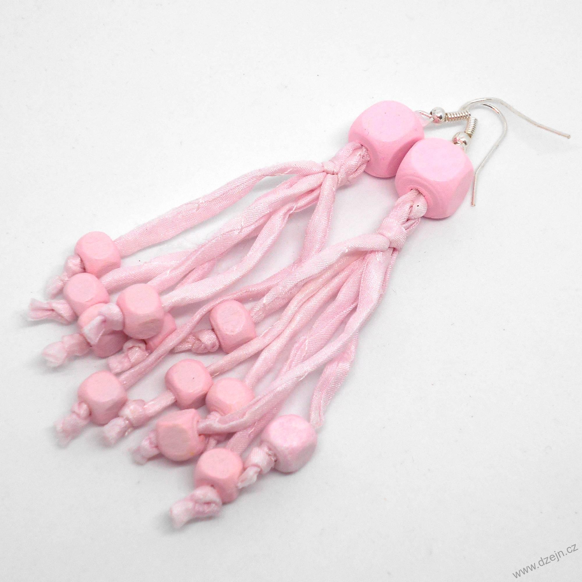 Náušnice jsou vyrobené ze světle růžových vlastnoručně barvených hedvábných šňůrek a dřevěných lakovaných korálků ve tvaru kostiček se zaoblenými hranami v růžové barvě.