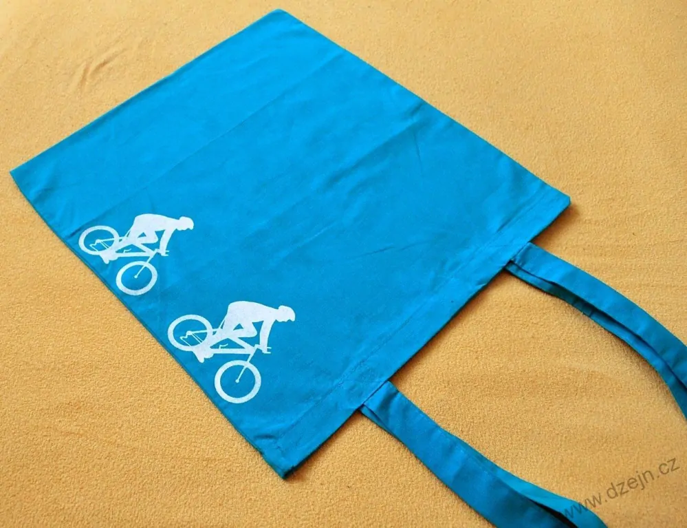 Na tmavší tyrkysové plátěné tašce jsou namalovaní dva bílí cyklisté technikou sítotisku. Taška má delší ucha.