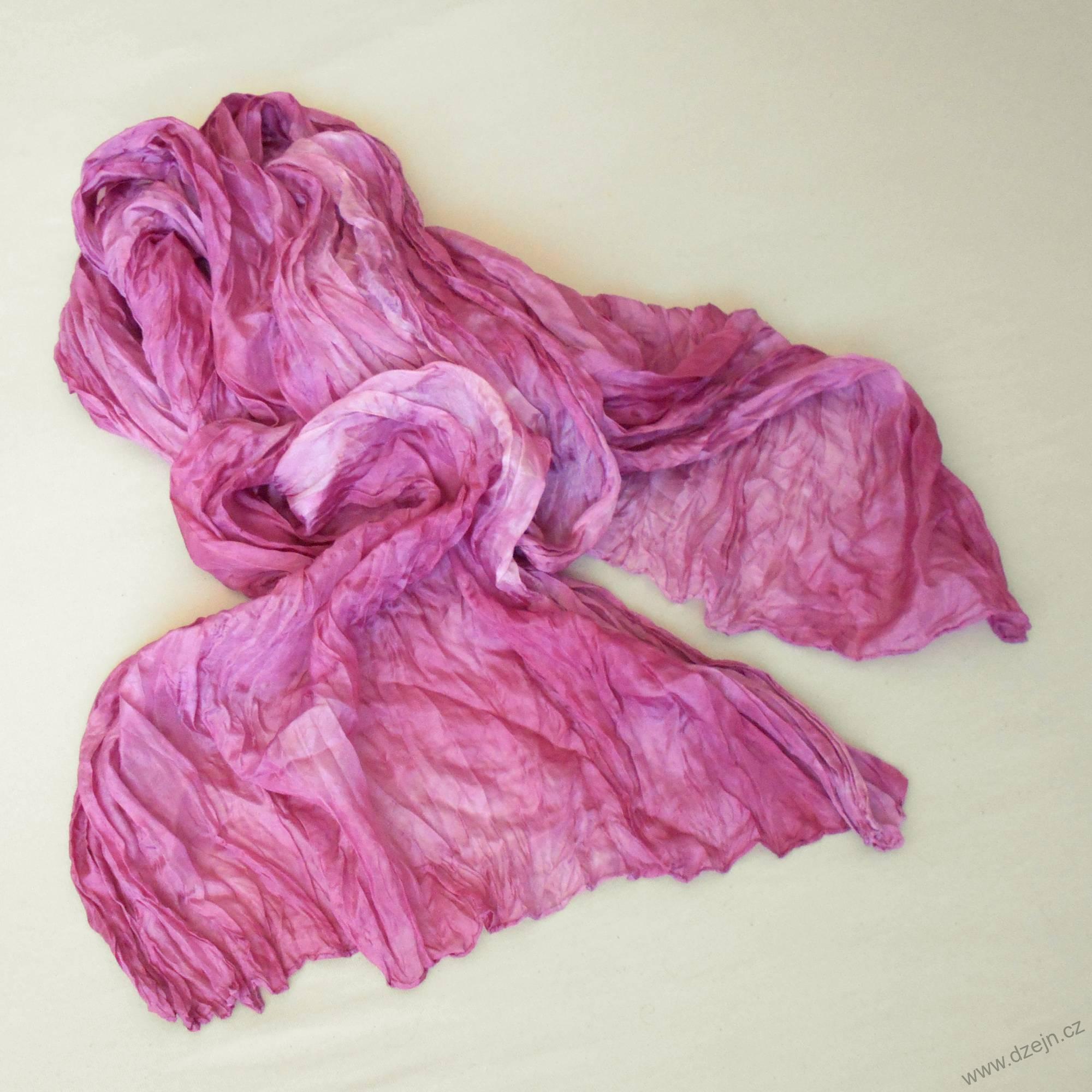 Hedvábná šála o rozměru 90x180 cm je nabarvená odstíny růžové a vínové (spíš bordové) barvy. Není vyžehlená, ale je vrapovaná. Vrapování dosáhneme tak, že ji po vyprání nebudeme žehlit, ale necháme uschnout stočenou. Pokud naopak chceme šálu rovnou, můžeme ji po vyprání ještě vlhkou vyžehlit.