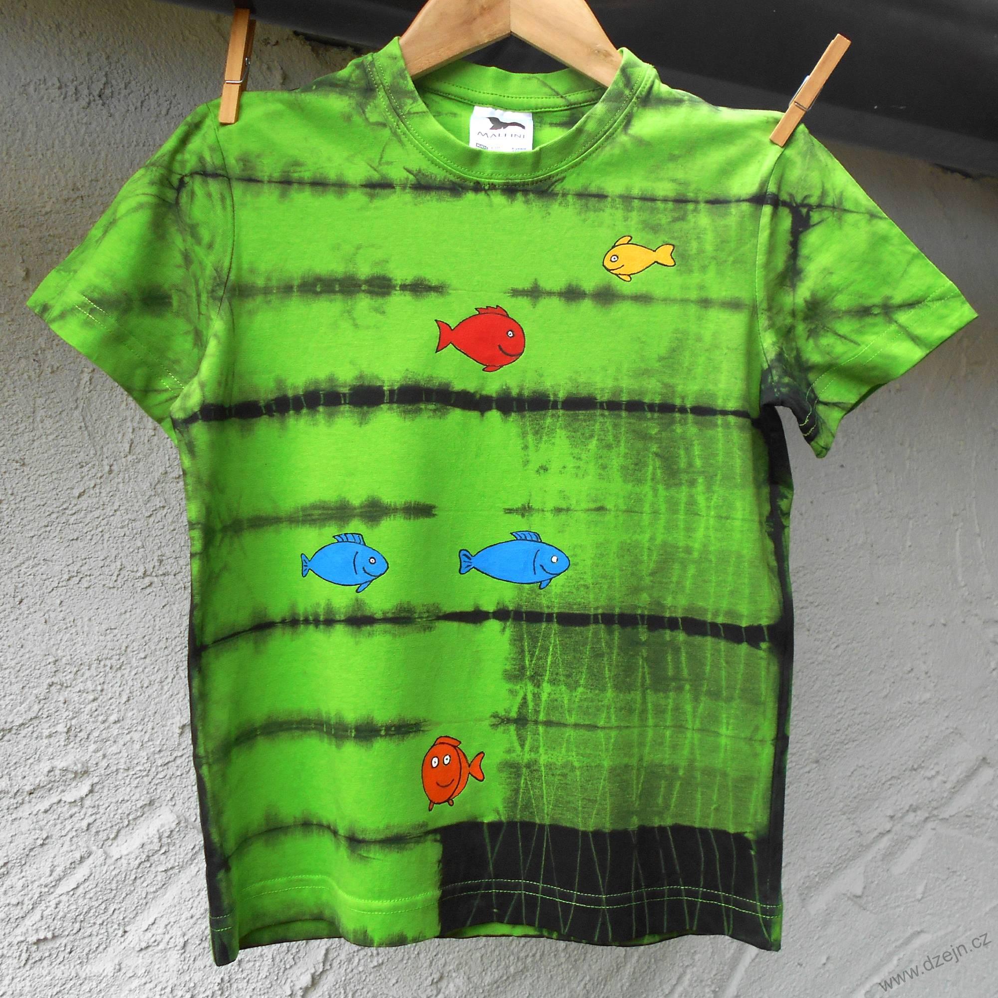 Dětské zelené tričko je batikované černou barvou, na přední straně jsou namalované různobarevné rybičky. Výrobce uvádí velikost na 8 let, věnujte ale pozornost rozměrům uvedeným níže.