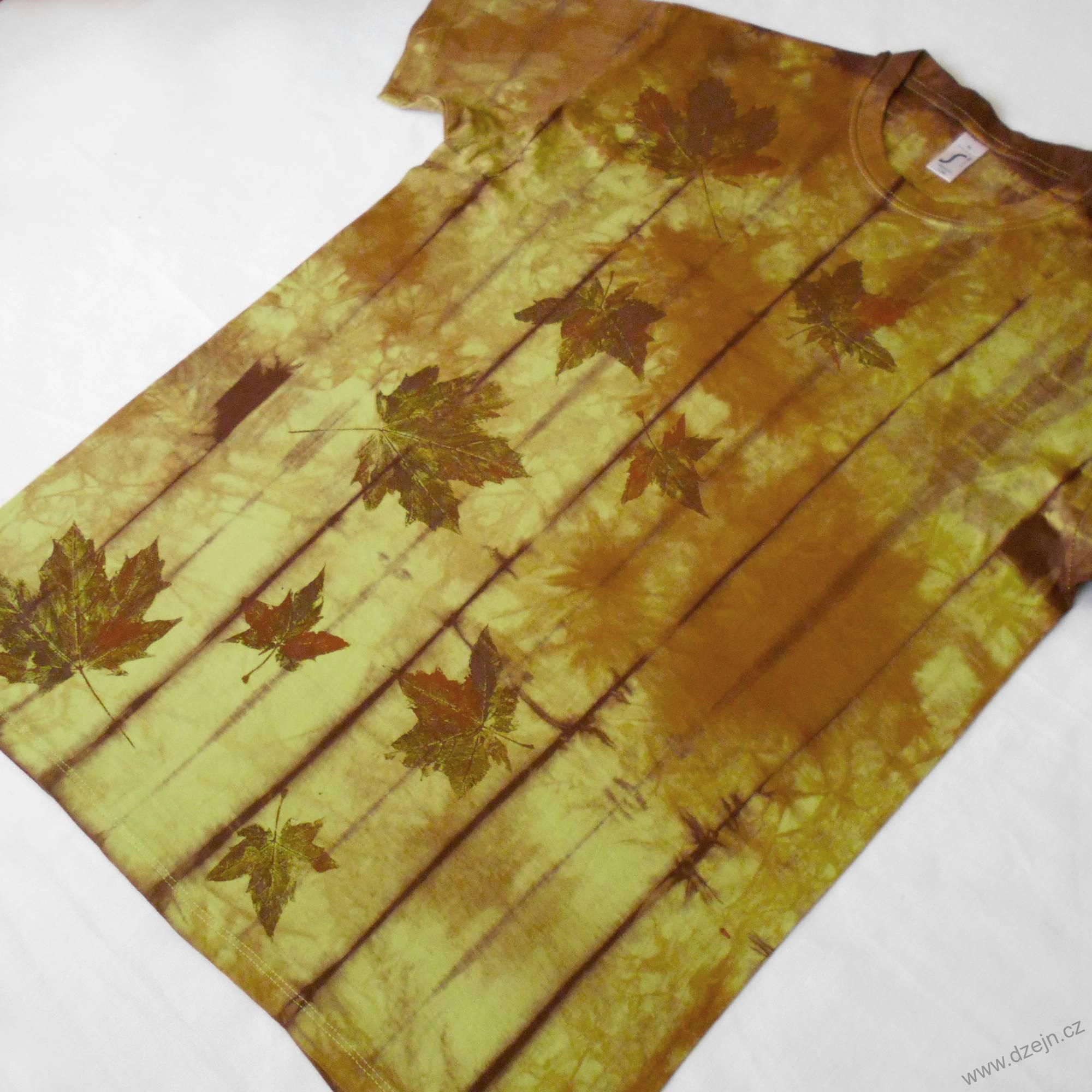 Světle zelené unisex tričko je batikované dvěma odstíny hnědé barvy, na přední straně jsou natištěné hnědé javorové listy.