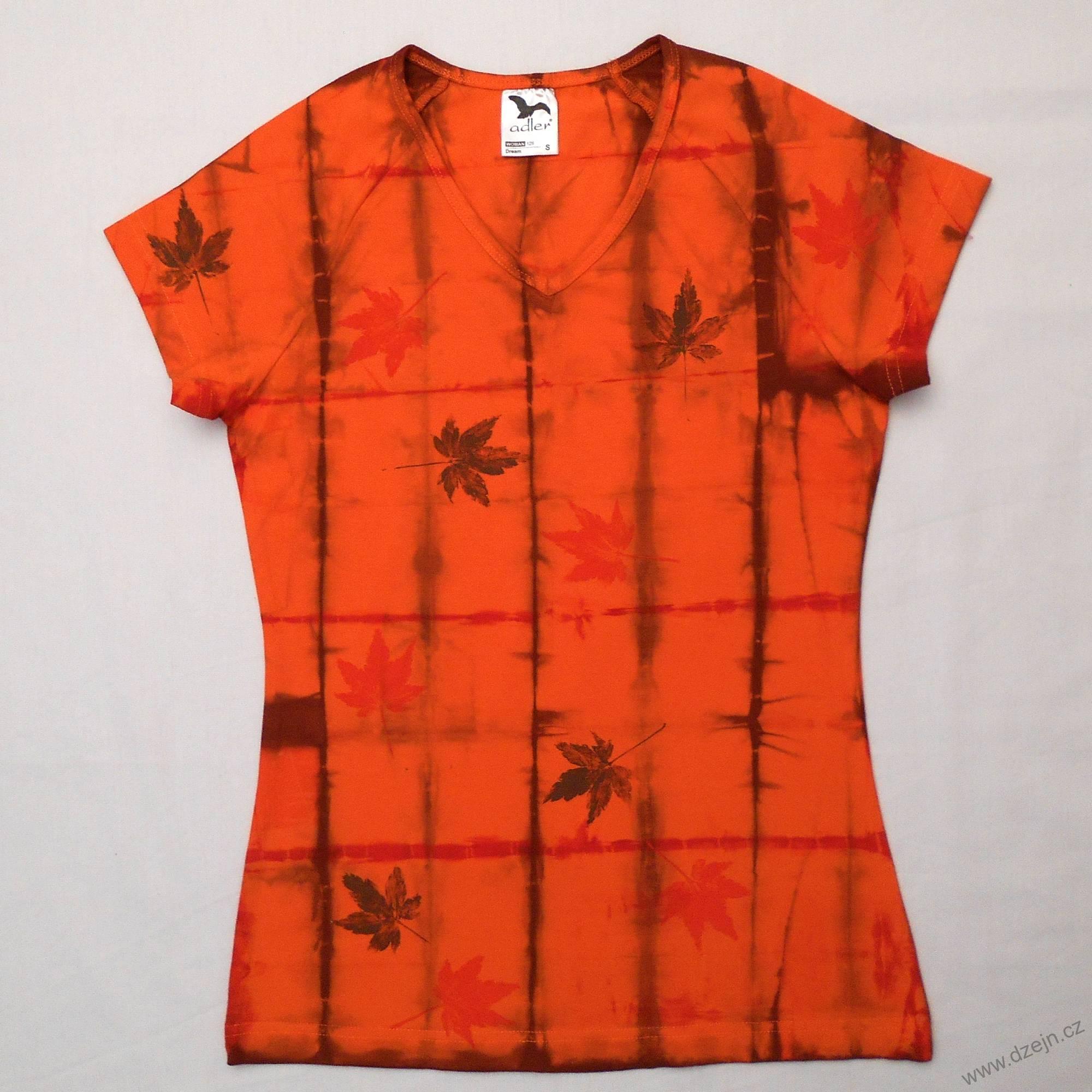 Dámské oranžové triko s výstřihem do V je batikované červenou a hnědou barvou, na přední straně jsou natisknuté červené a hnědé listy ozdobného japonského javoru. Výrobce uvádí velikost S, níže najdete přesné rozměry tohoto konkrétního trička.