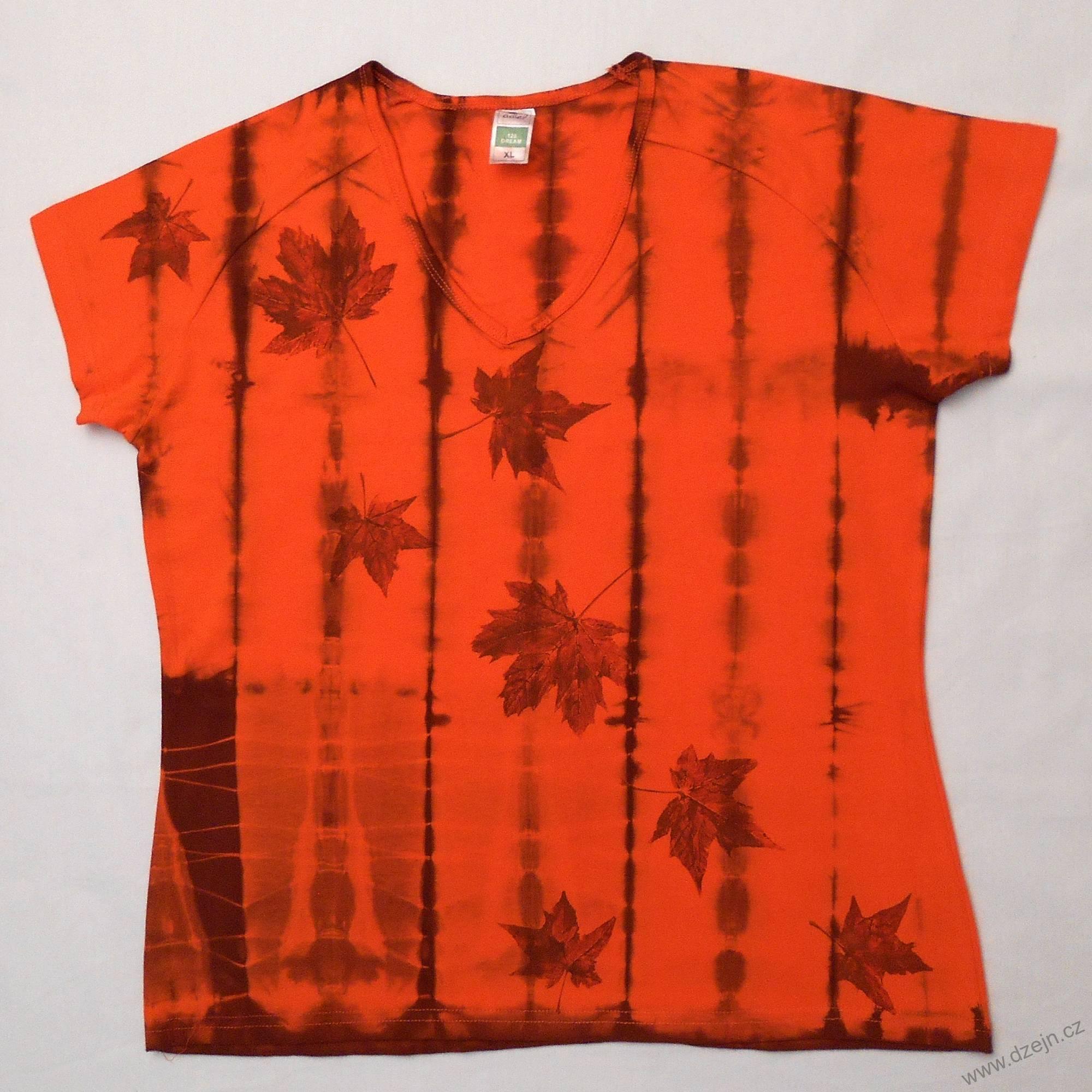 Oranžovo-hnědé batikované dámské triko s listy XLskladem 1 ks450 Kč/ ks