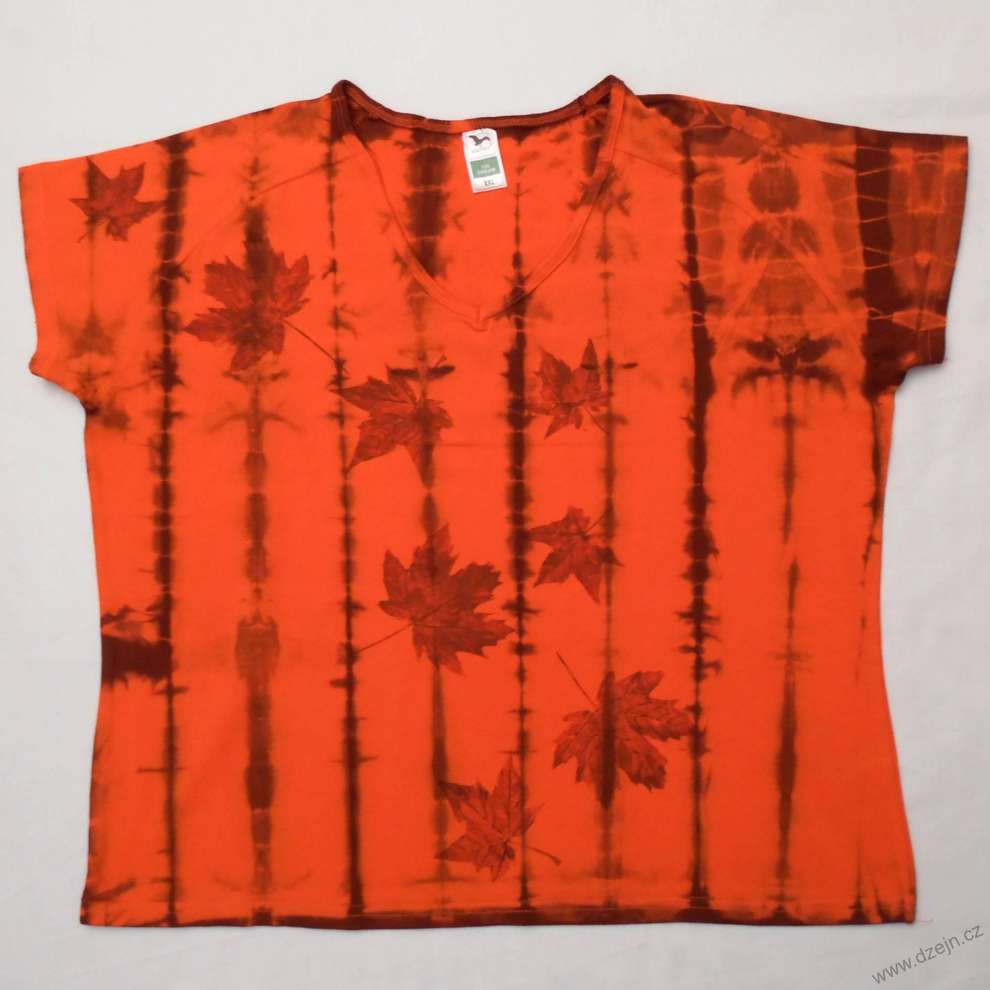 Dámské oranžové triko s výstřihem do V je batikované hnědou barvou, na přední straně jsou natisknuté hnědé javorové listy. Výrobce uvádí velikost XXL, jedná se o širší střih, věnujte proto pozornost níže uvedeným rozměrům tohoto konkrétního trička.