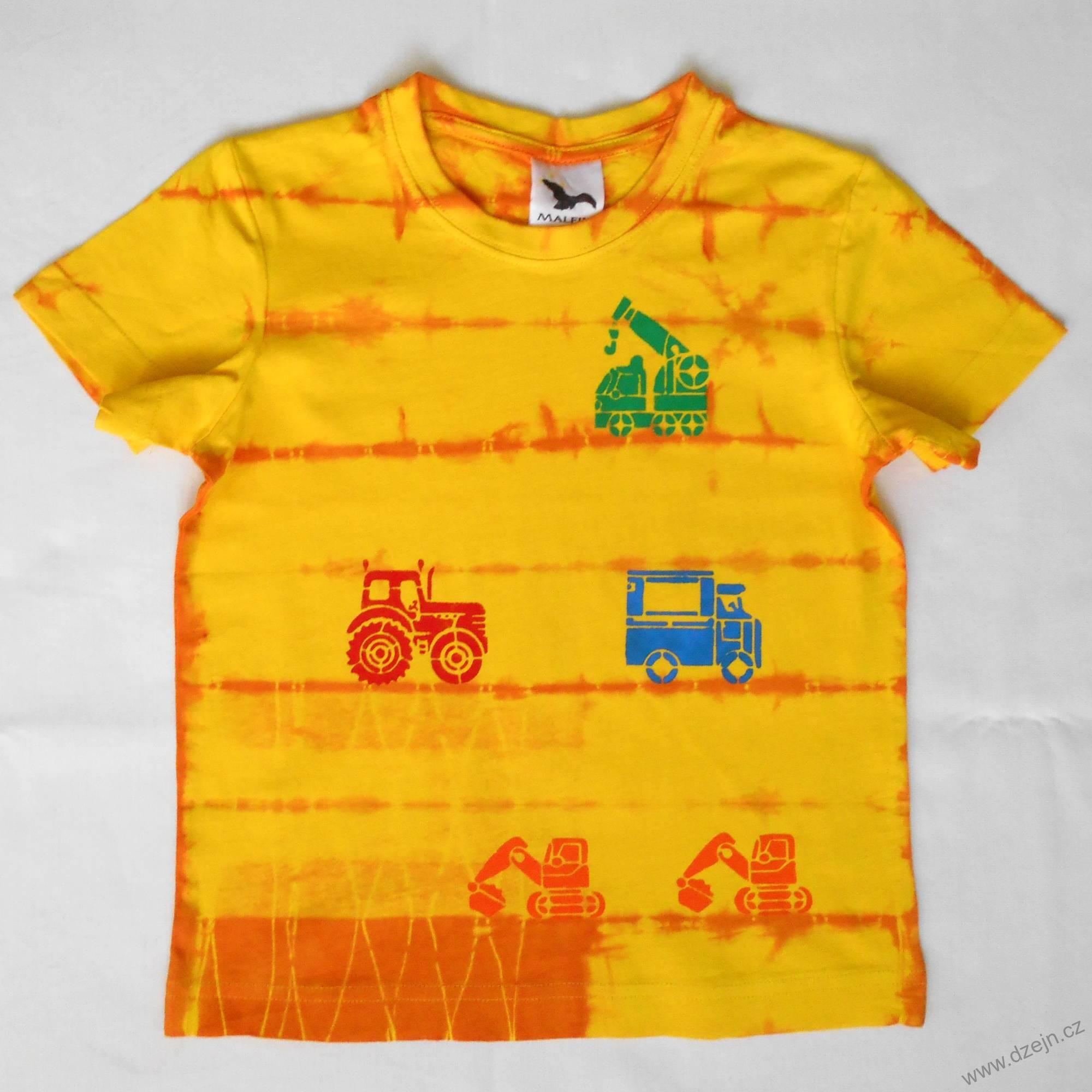Dětské tričko žluté barvy je batikované oranžovou barvou, na přední straně jsou namalované dva oranžové bagry, červený traktor, modrý náklaďák a zelený jeřáb. Výrobce uvádí velikost na 6 let, ale věnujte prosím pozornost rozměrům uvedeným níže.
