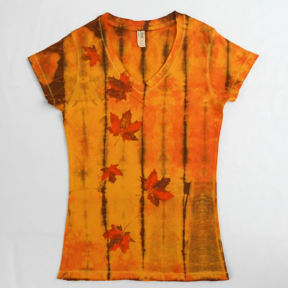 Dámské tmavě žluté triko s výstřihem do V je batikované oranžovou a hnědou barvou, na přední straně jsou natisknuté oranžovohnědé listy javorové listy. Tričko má zajímavě řešené lemy (viz doplňková fotka) Výrobce uvádí velikost L, ale má užší delší střih, níže najdete přesné rozměry tohoto konkrétního trička.