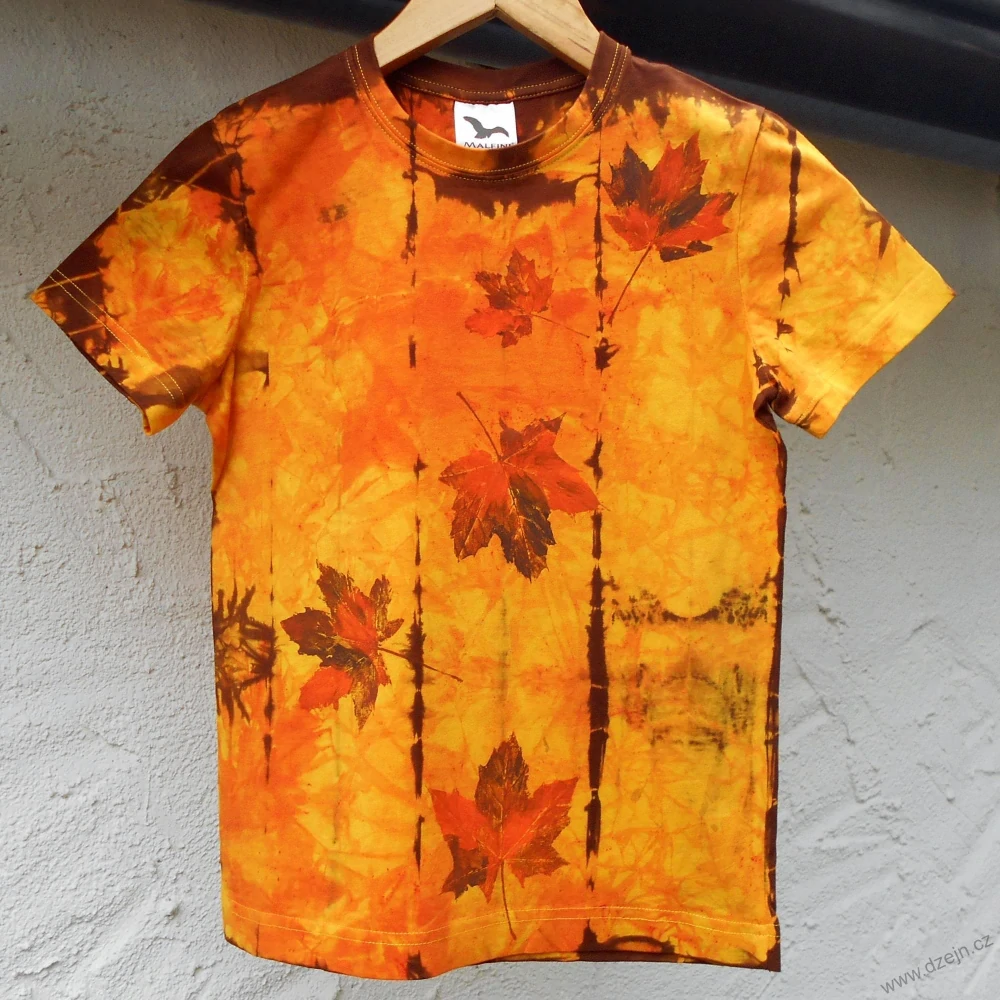 Žluté dětské tričko je batikované oranžovou a hnědou barvou a na přední straně jsou natisknuté oranžovohnědé javorové listy. Výrobce uvádí velikost na 8 let (134 cm), ale věnujte pozornost rozměrům uvedeným níže.