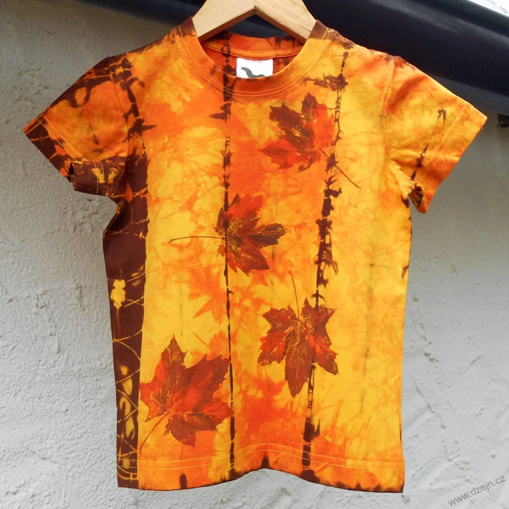 Žluté dětské tričko je batikované oranžovou a hnědou barvou a na přední straně jsou natisknuté oranžovohnědé javorové listy. Výrobce uvádí velikost na 4 roky (110 cm), ale věnujte pozornost rozměrům uvedeným níže.