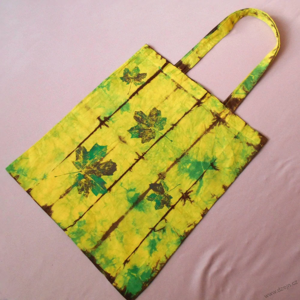Plátěná taška tmavě žluté barvy je batikovaná zelenou a hnědou barvou, na jedné straně jsou natištěné zelenohnědé javorové listy. Taška má delší ucha.