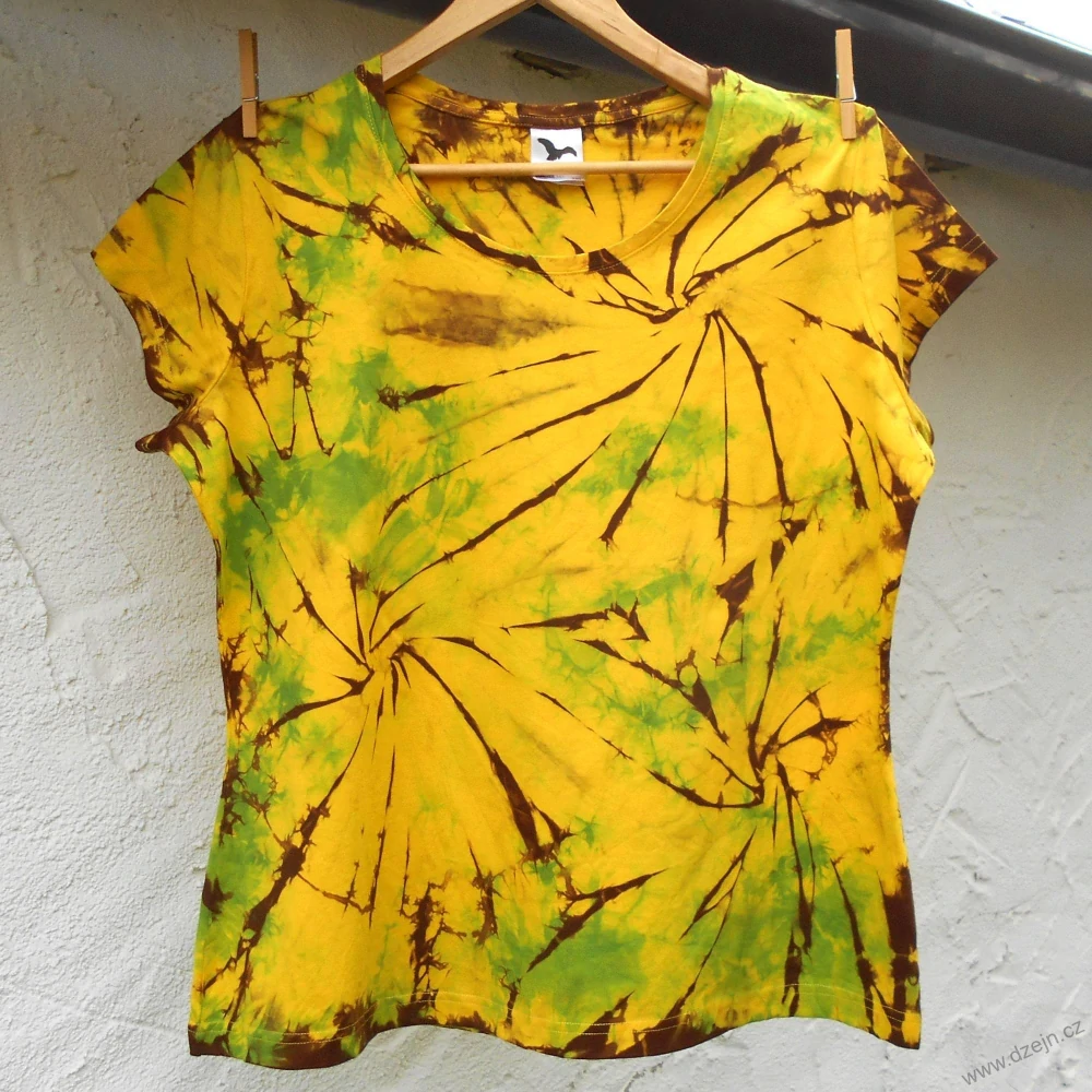 Dámské žluté tričko je batikované zelenou a hnědou barvou. Tričko je mírně projmuté a má kulatý výstřih. Výrobce uvádí velikost XXL, níže najdete přesné rozměry tohoto konkrétního trička.